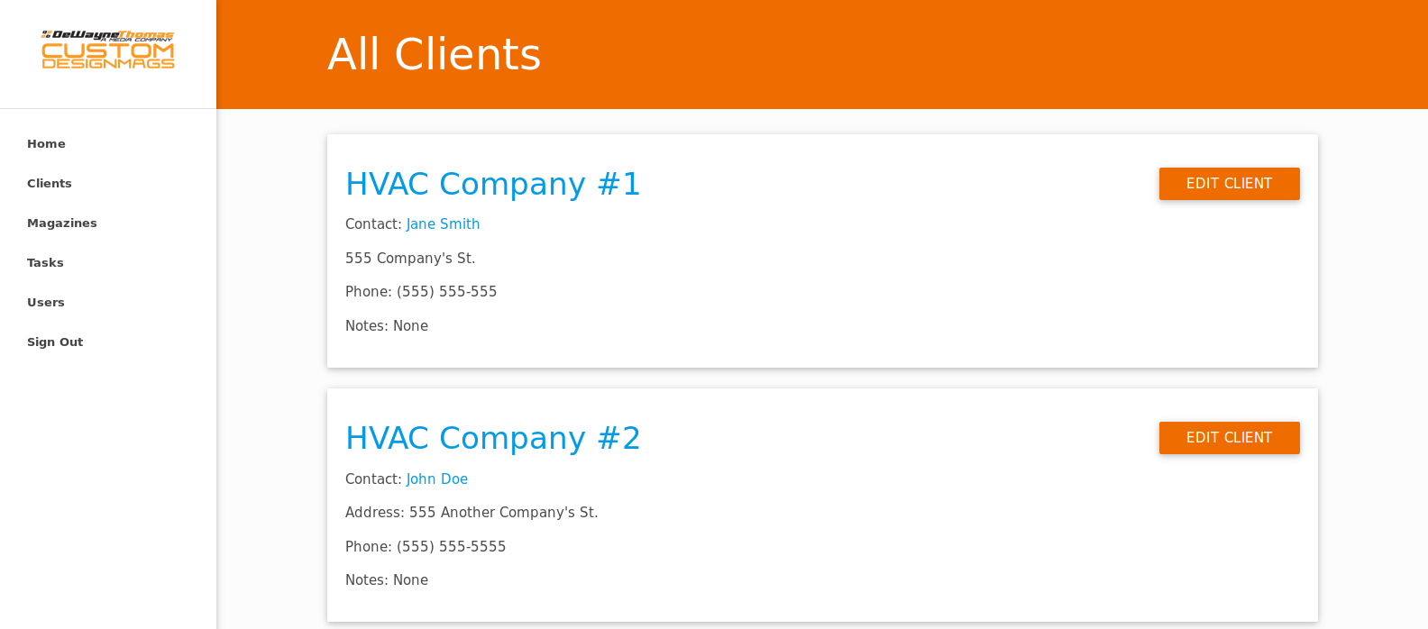 - Easily see data about all of your clients (company, location, contact info, phone, magazines, and notes)