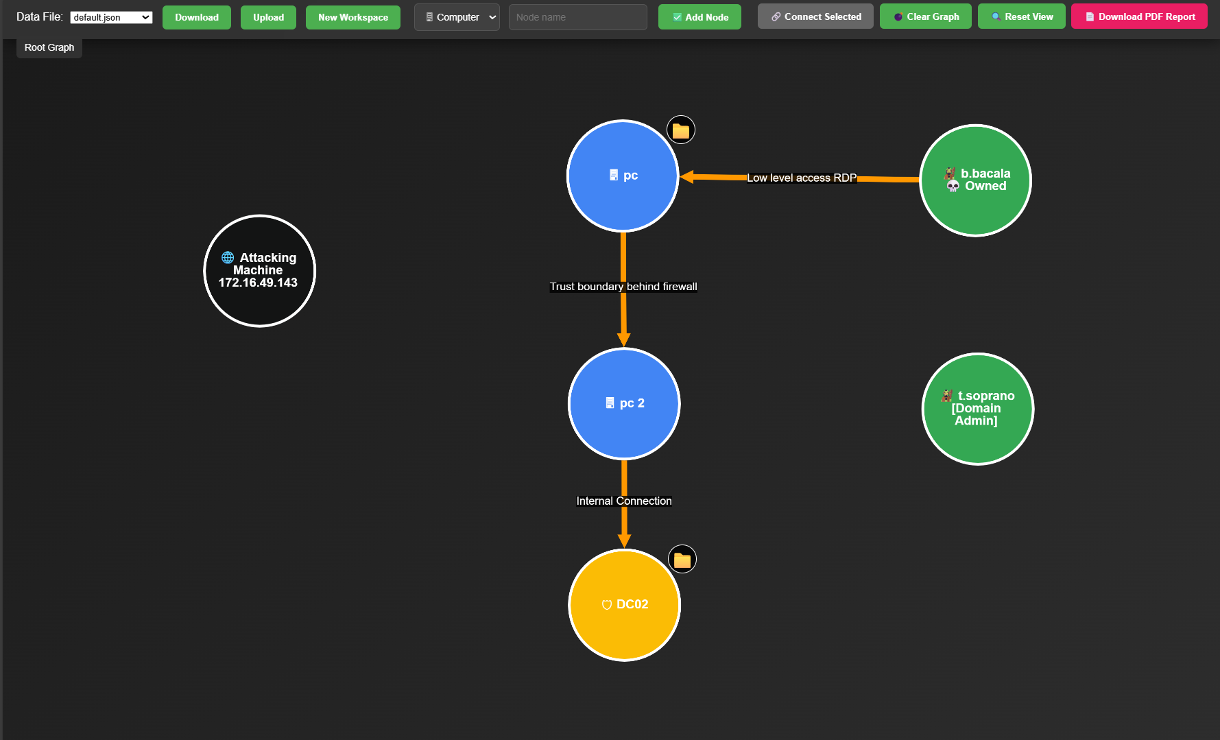 - Interactive Graph: Drag-and-drop nodes with icons (PC, Person, Admin, Lock, Skull, Endpoint) for visual attack mapping.