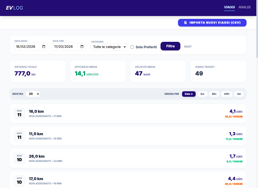 EVLog is an application that allows you to export trips from the official Volvo app in CSV format and import them into this system. This enables you to maintain a historical record and perform analysis and statistics on your trips.
