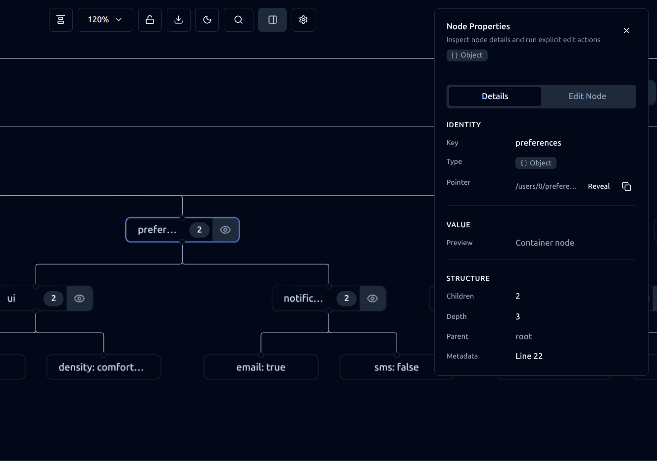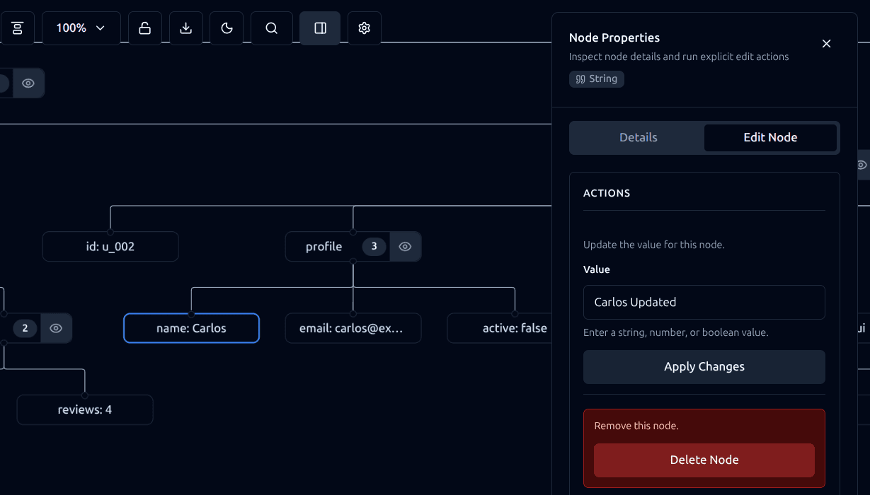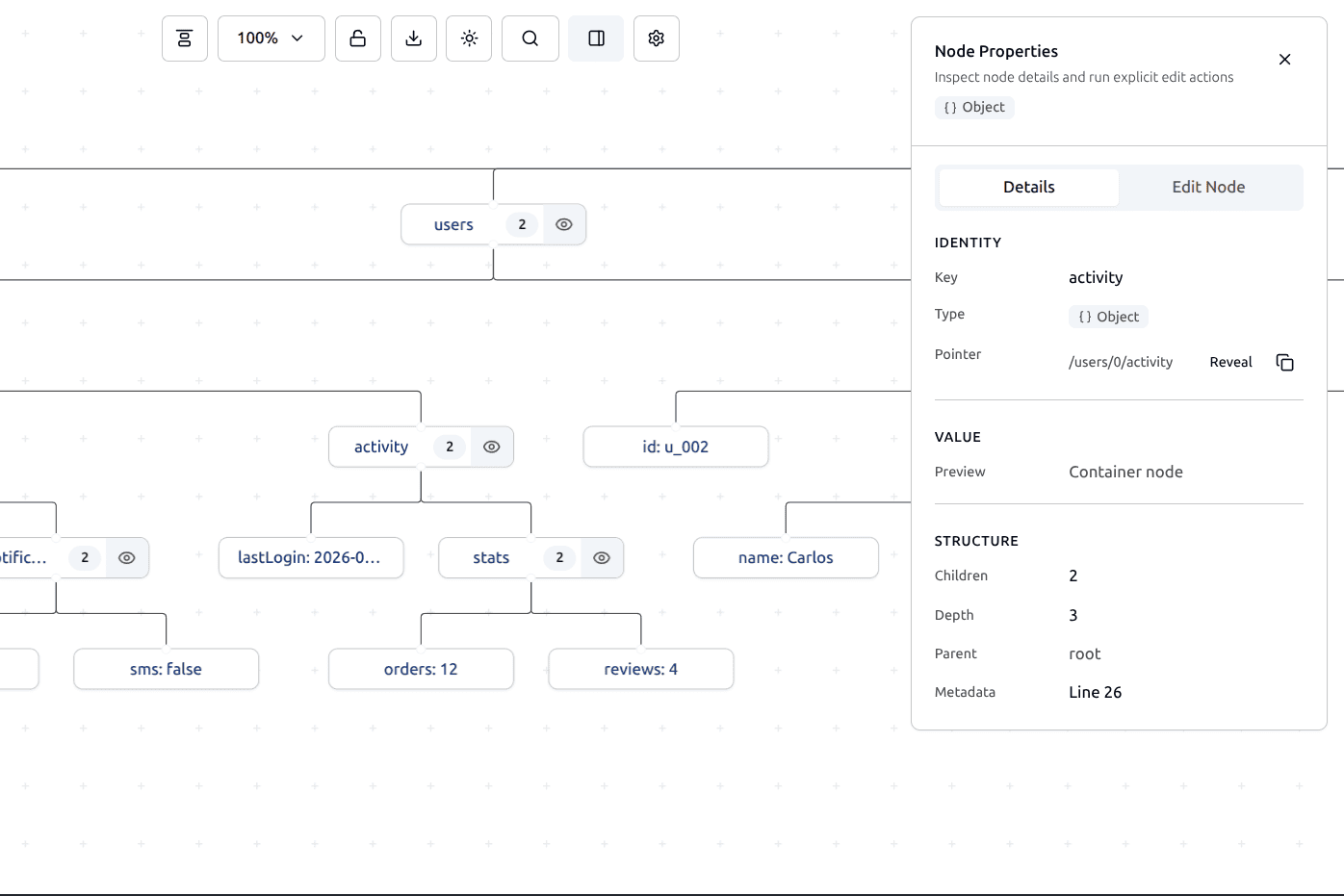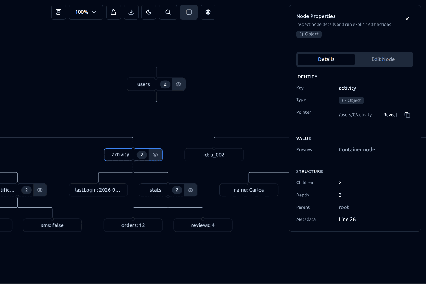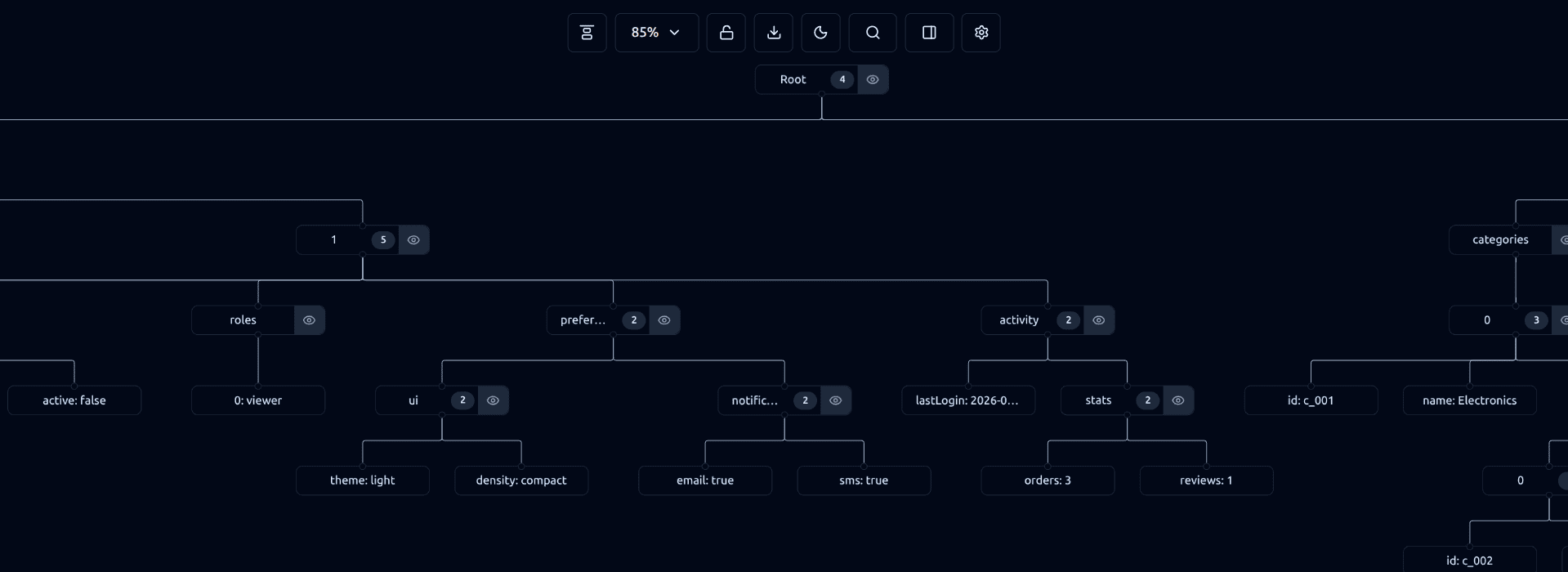 - Explore deeply nested structures - Navigate JSON as a full node graph where every object, array, and value is a visible, interactive element, regardless of nesting depth.