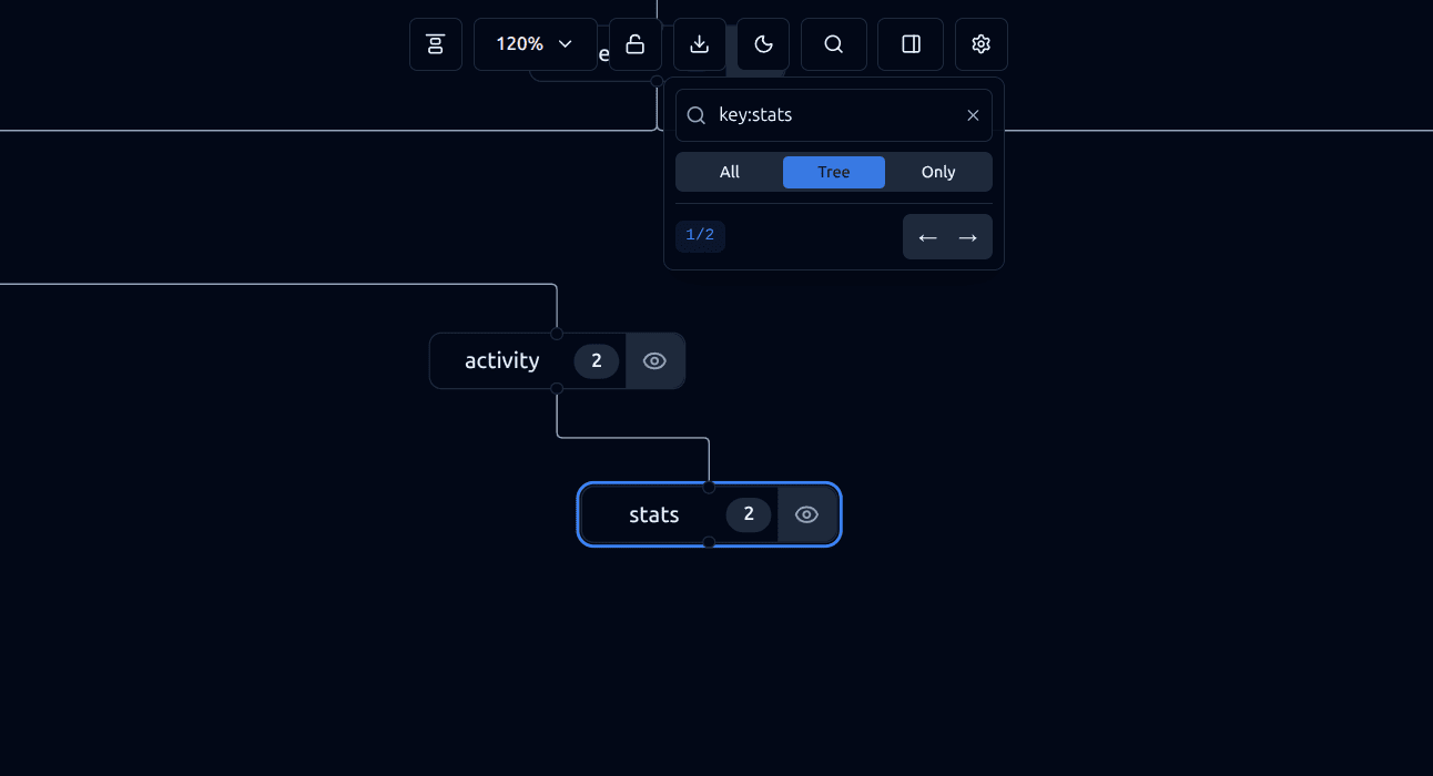 key:,value:,type:,path:, anddepth>/depth</depth=. Combine multiple tokens with AND logic to express precise structural queries across the entire graph. - Projection modes for focused analysis. Search results can be visualized in three ways: highlight matches while keeping the full graph visible, show only matches and their ancestor path for structural context, or isolate matches exclusively. This enables targeted analysis without losing orientation.
