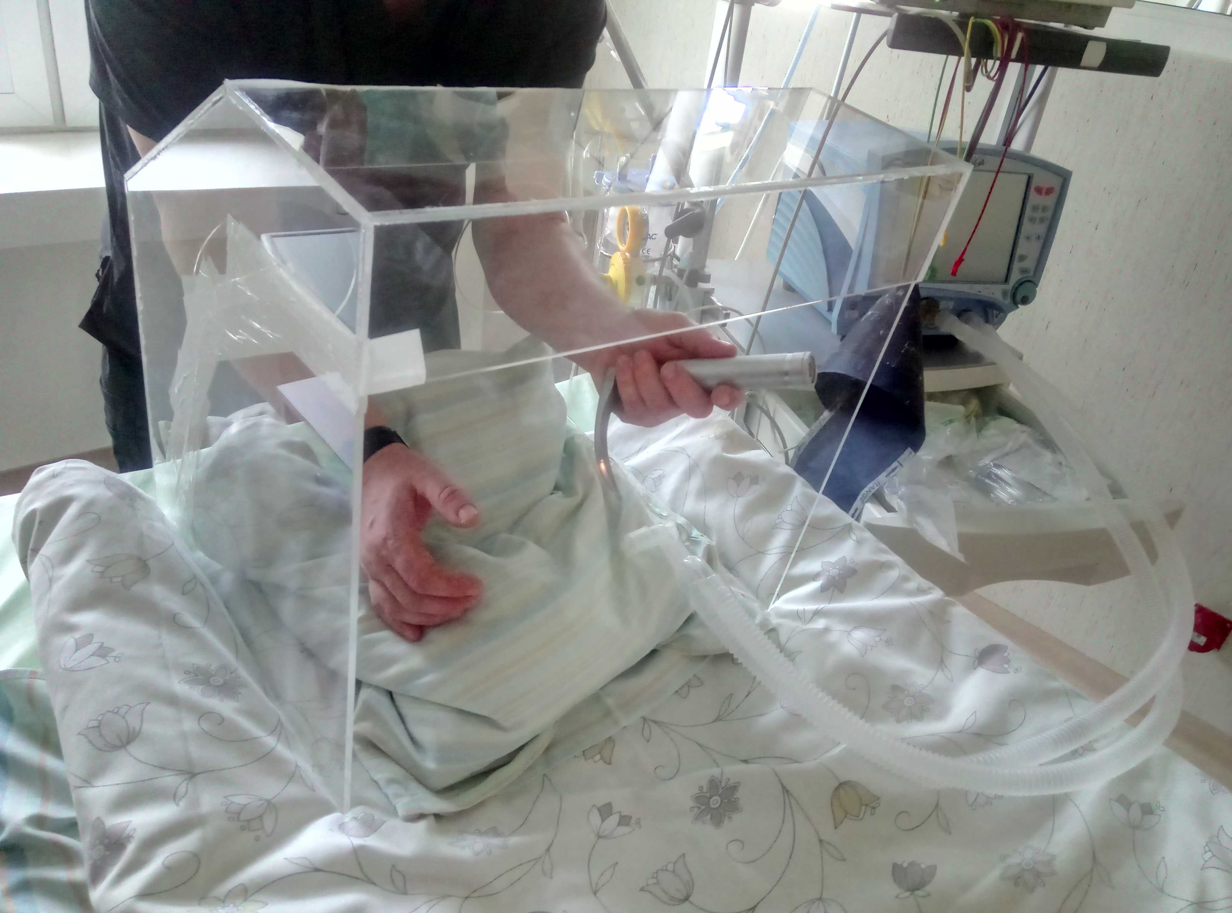 The box design is based on Dr. Yung-Lai’s Aerosol Box (https://sites.google.com/view/aerosolbox/design) and a slanted design by EverythingAcrylic in Philippines (https://www.facebook.com/everythingacrylic.ph/). Currently we are prototyping and testing a v.1.2 design with Santaros Klinikos in Vilnius, Lithuania. The main changes from the original Dr. Yung-Lai's design, based on feedback from an ICU doctor: