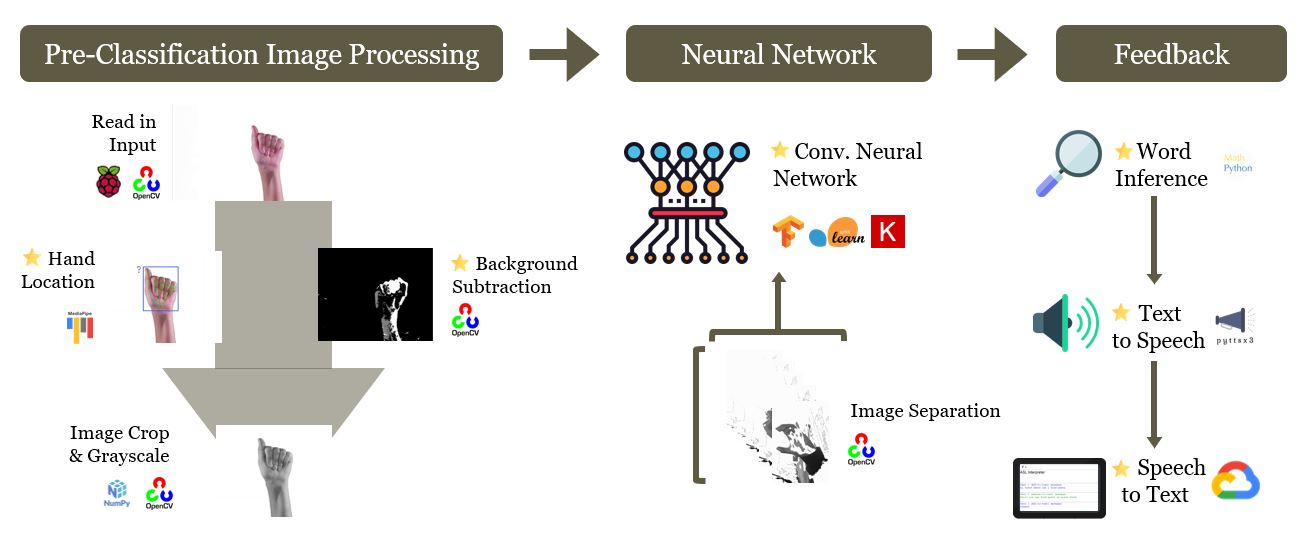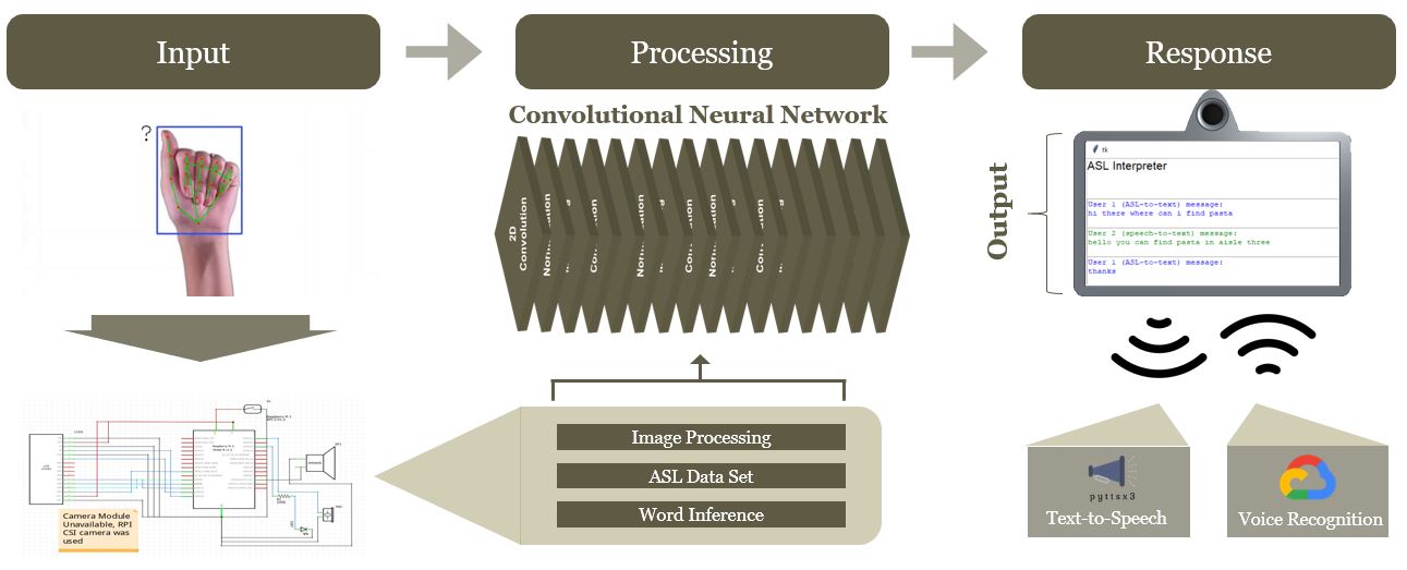 To help facilitate communication and aid the issues many of the individuals in the hearing impaired community face, We-Sign aims to create a seamless interaction between individuals with severe hearing impairments and individuals without this impairment. By using machine learning and natural language processing, We-Sign is able to recognize 24 of the 26 letters within the American Sign Language (ASL) framework when the user interacts with the device’s camera. The live feed is then carried through We-Sign’s interpretive software to display a message to the individual. A two-way interaction is achieved by allowing the individual receiving the text display to speak into the device’s microphone, where the message is displayed via text to the auditorily disabled individual.