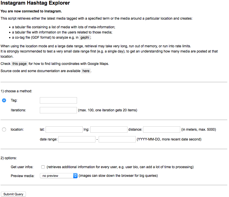 Instagram Hashtag Explorer is a small script that connects to the Instagram API with a user's credentials, retrieves either the latest media tagged with a specified term (via the /tags/../media/recent API call) or media around a particular location (via the /media/search API call), and creates: