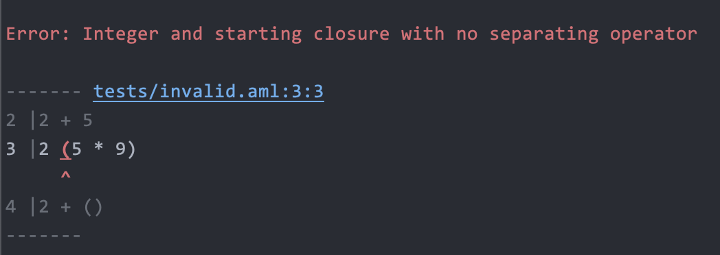 When an input is found to be invalid during or after parsing, a detailed error message will be printed showing the exact line and column that is invalid.